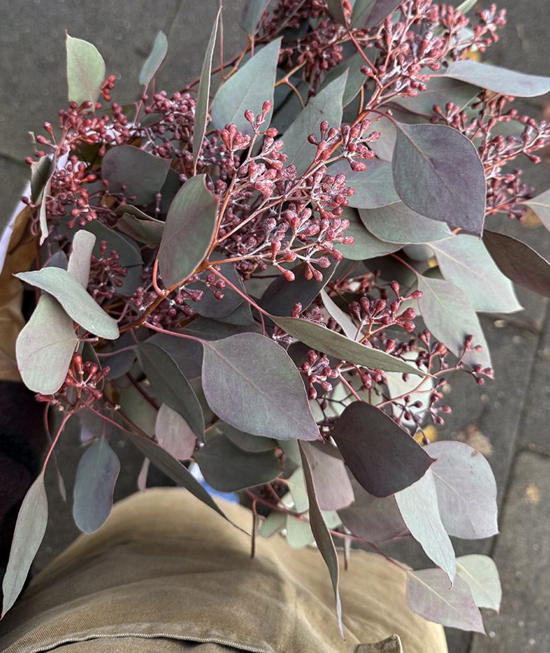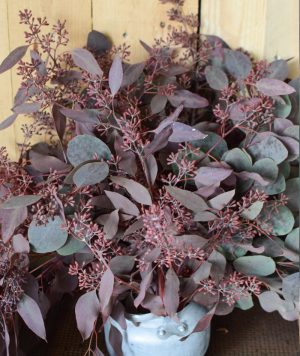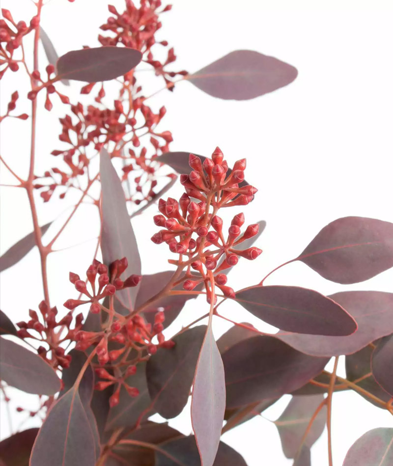 Der Eukalyptus Populus präsentiert sich in einer wunderschönen Färbung und ist ideal zum Kranzbinden geeignet. Sein besonderer Vorteil: Er trocknet ansehnlich ein und behält seine Form. Die Früchte setzen Highlights. Ausserdem eignet er sich auch als Solitär-Deko in der Vase. Die Stiele dieser Sorte zeichnen sich durch relativ große Blätter und Beeren in einem warmen Rotton aus.